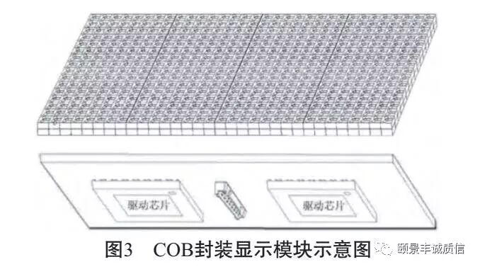 随着人们对户内外的LED显示屏的分辨率要求越来越高,如果还是采用传统的SMD LED器件进行贴片组装LED显示屏,那么一方面,由于LED显示器件越做越小,工艺难度急剧增大,良率低,导致单颗LED器件成本增大;其次,小尺寸LED器件对贴片设备的精度也要求非常高;第三,LED显示屏的点间距越小,所需贴片的LED器件成几何数量级增加,大大降低LED屏的制造效率。而COB显示模块,采用集成封装的方式,省去单颗LED器件封装后再贴片的工艺,正好解决以上问题。板上封装(Chip on Board)是一种将多颗LED芯片直接安装在散热PCB基板上来直接导热的结构。COB封装集合了上游芯片技术,中游封装技术及下游显示技术,因此COB封装需要上、中、下游企业的紧密合作才能推动COB LED显示屏大规模应用。如图3所示,为一种COB集成封装LED显示模块,正面为LED灯模组构成像素点,底部为IC驱动元件,最后将一个个COB显示模块拼接成设计大小的LED显示屏。